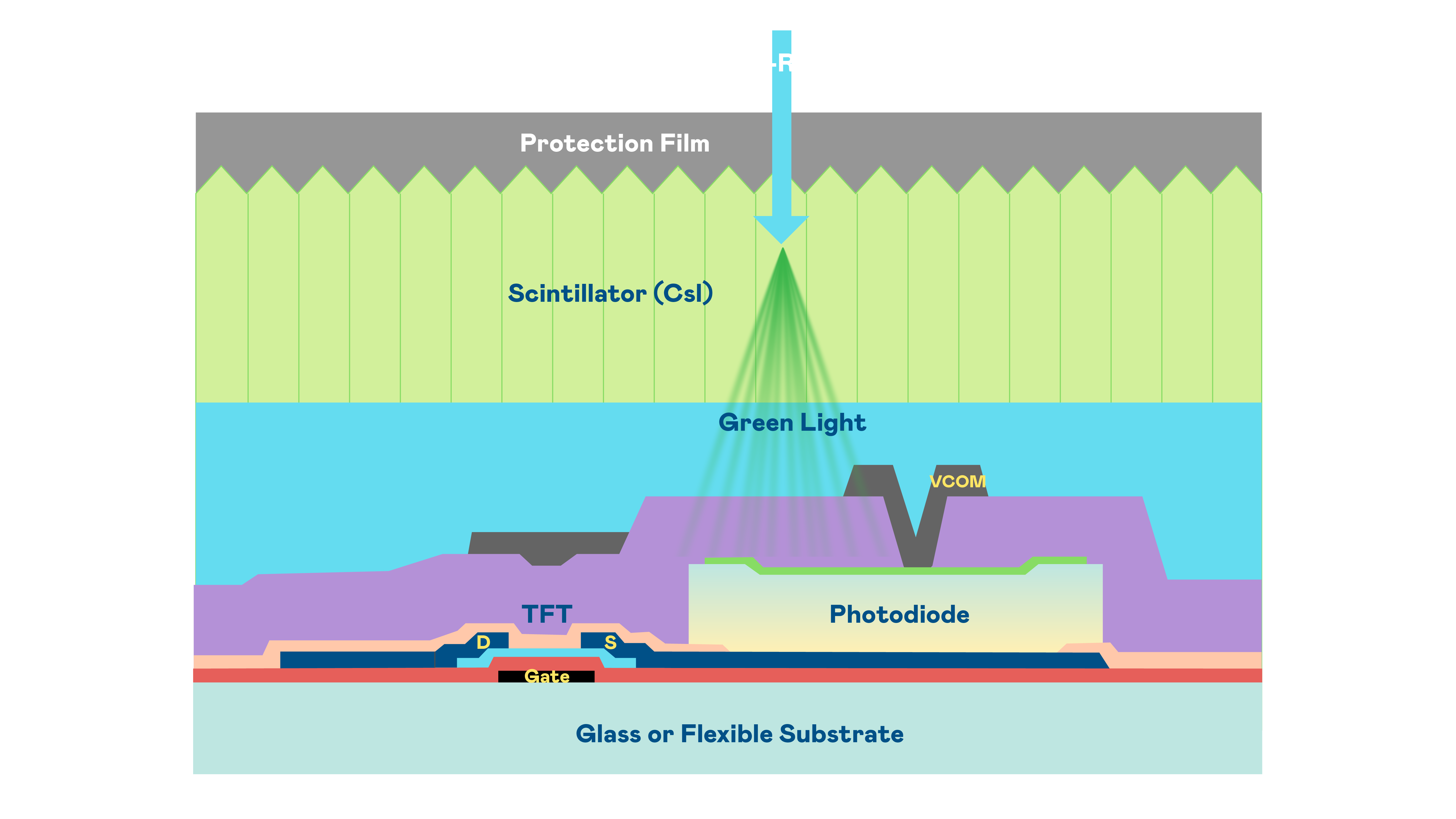 DB真人的X光影像感測陣列使用薄膜電晶體 (TFT) 作為每個像素的讀取開關,搭配光電二極體(Photodiode)的光電轉換元件,用以感測X光影像訊號。